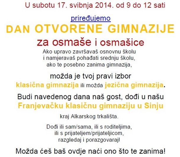 Franjevačka klasična gimnazija u Sinju organizira Dan otvorene gimnazije sutra, 17. svibnja, od 9 do 12 sati.